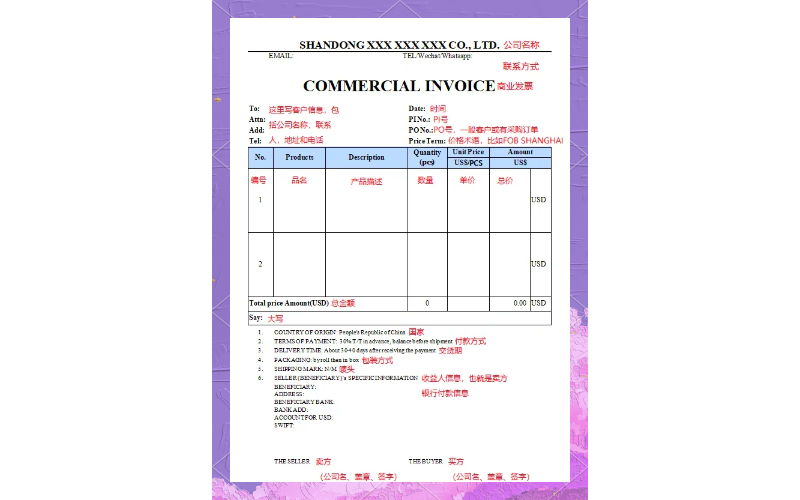 - 买卖双方信息: 出口商(Seller/Exporter)与进口商(Buyer/Importer)的法定名称、详细地址、联系方式及税号等。这是海关审核贸易真实性的首要依据。