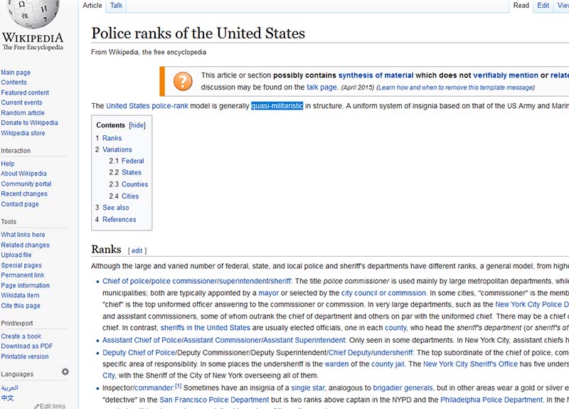 其次,我们还要大概了解国外的相应建制,从而在对应关系上找出语言上的共通之处。在经过了一番搜索之后,失望的是,国外的编制以及警察系统都比较简单,即便是偶有中队或小队的称号,也只是从主要系统中分离出来的一小部分,没有自成一家,形成自上而下完整的编制系统。因此,并没有资料显示有类似国内这么复杂的单位名。