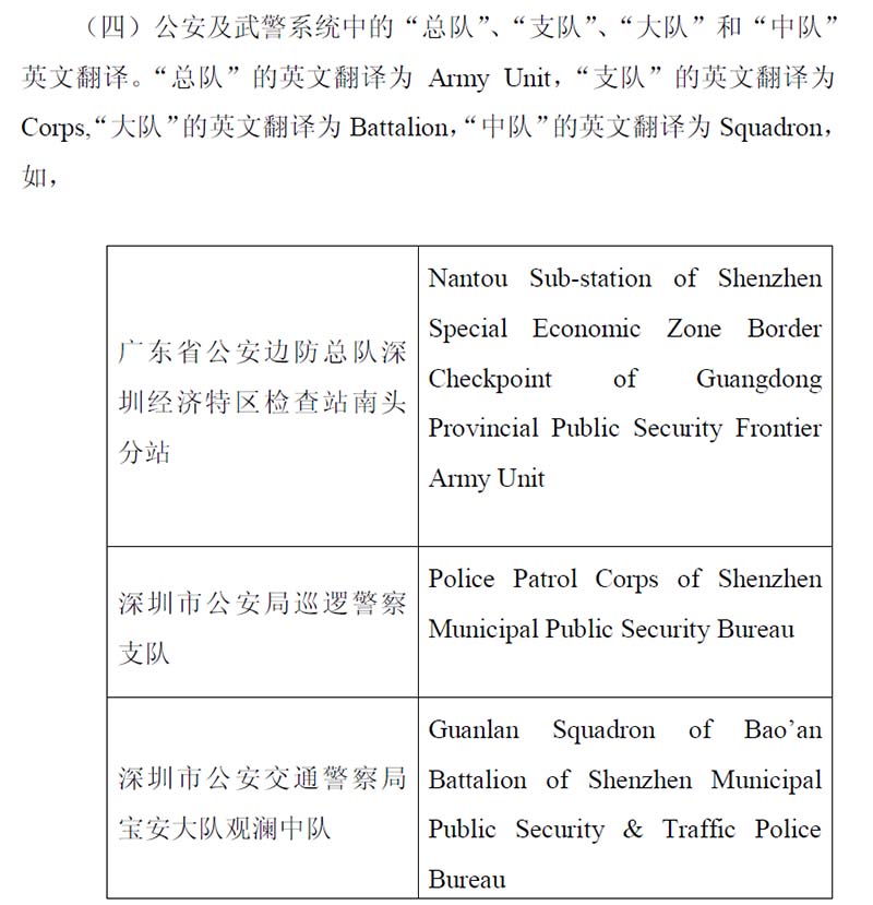 第二,参照既有指导资料。有时候,如果一味地按照某种思路,如上述对应关系方法来翻译,在遇到有些约定俗成的处理方式时,就显得有些站不住脚。为了方便起见,我们找到《深圳市公共场所双语标志英文翻译规则及实施指南》作为参考。这是一份由外事办公室与翻译协会联合发行的地方性翻译类指导性文件,具有一定的权威性。其中,公安及武警系统中的“总队”、“支队”、“大队”、“中队”分别翻译成了Army Unit, Corps, Battalion, Squadron. 并分别给出了不少现成的单位翻译的例子。现选摘部分: